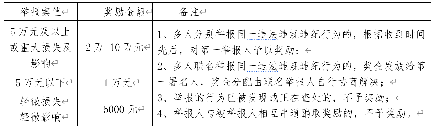 三、举报内容一经查实,公司给予举报人奖励,具体标准如下表所示: