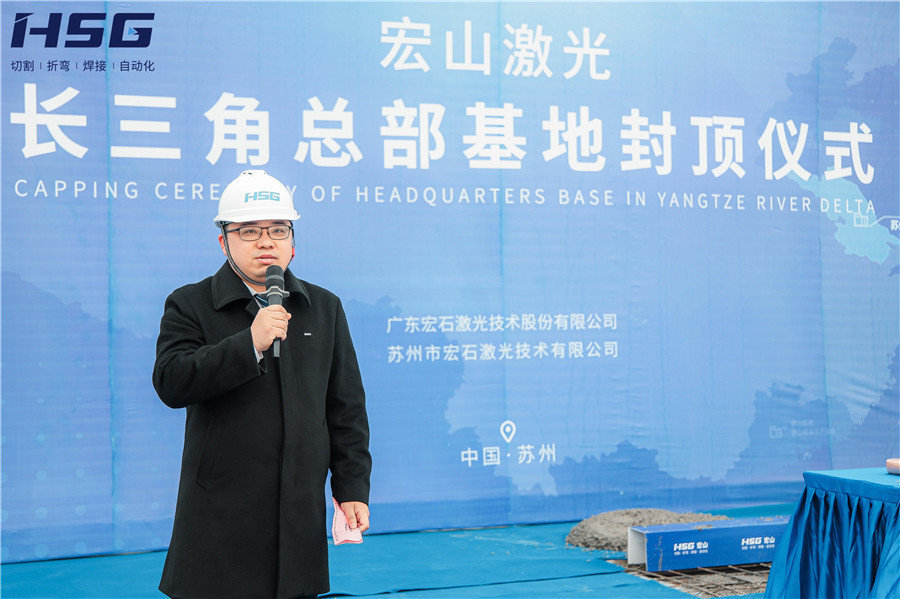 在听取基地建设进度汇报后,宏山激光董事俞宏标先生为此次活动发表致辞,俞总对多方施工单位表达了感谢,并表示:长三角总部基地的建设,是宏山激光国内乃至全球布局发展的重要一环,是宏山激光增资扩产、扩大企业实力、完善战略布局的重要步骤。未来,长三角总部基地将扎根苏州,面向华东、华北地区,为用户提供“家门口”的激光智能装备服务。